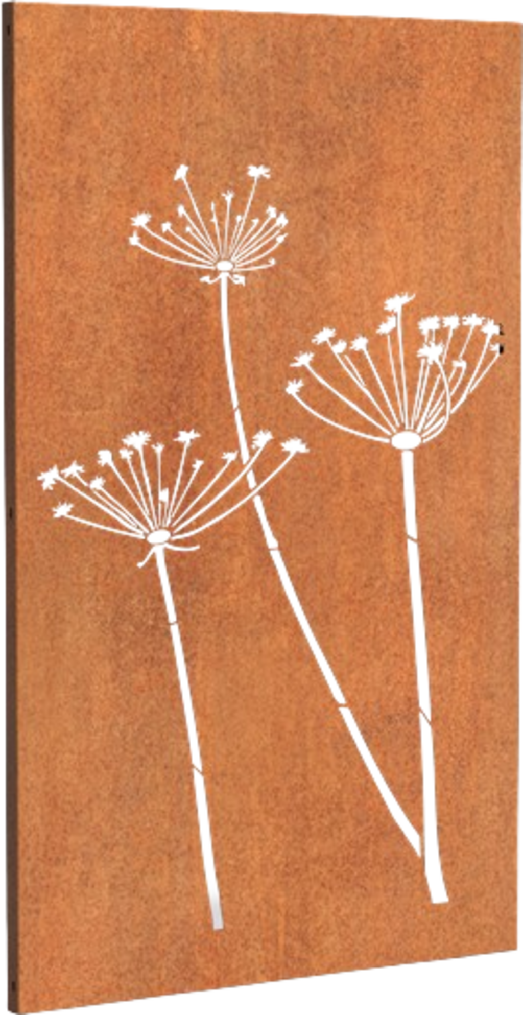 Remarque : Le panneau est livré sans patine de rouille. Celle-ci se développe avec le temps, au bout de 4 à 5 mois, en fonction des conditions météorologiques et de l'emplacement. Pour des résultats plus rapides, l'élément peut être traité avec un accélérateur de rouille.