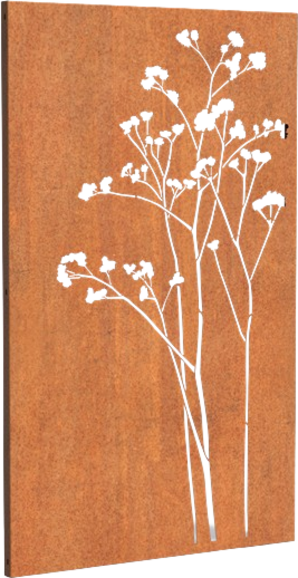 Remarque : Le panneau est livré sans patine de rouille. Celle-ci se développe avec le temps, au bout de 4 à 5 mois, en fonction des conditions météorologiques et de l'emplacement. Pour des résultats plus rapides, l'élément peut être traité avec un accélérateur de rouille.