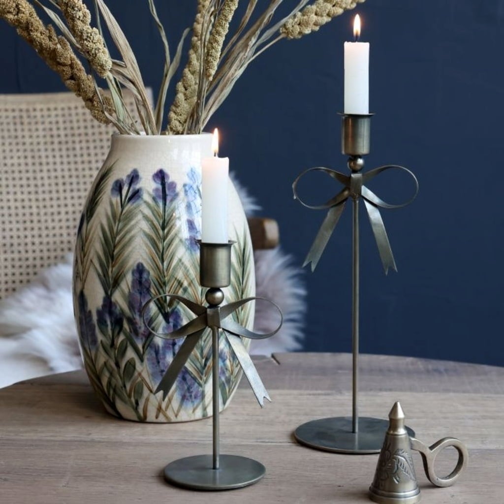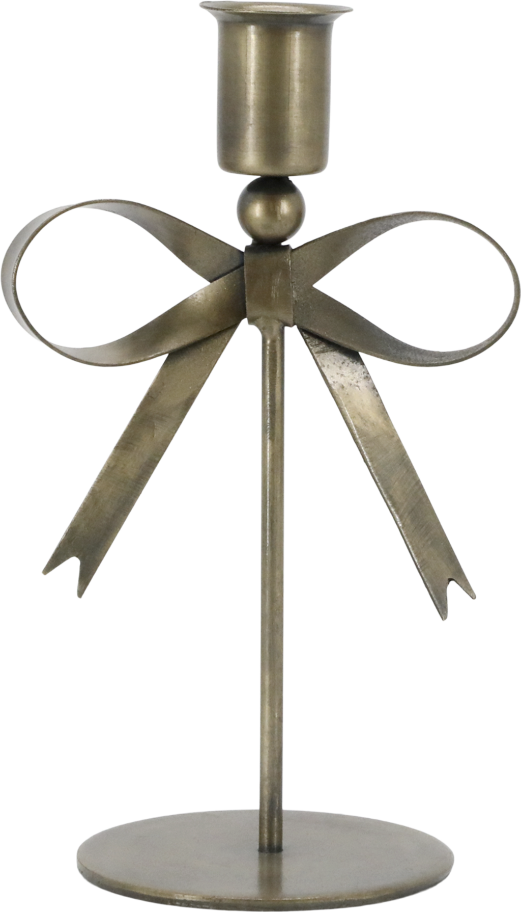 Ce bougeoir en fer, au fini laiton antique, diffuse une atmosphère chaleureuse et festive dans chaque pièce. Son design orné d’un nœud en fait un véritable point de mire et convient aussi bien aux mini-bougies qu’aux chandelles.