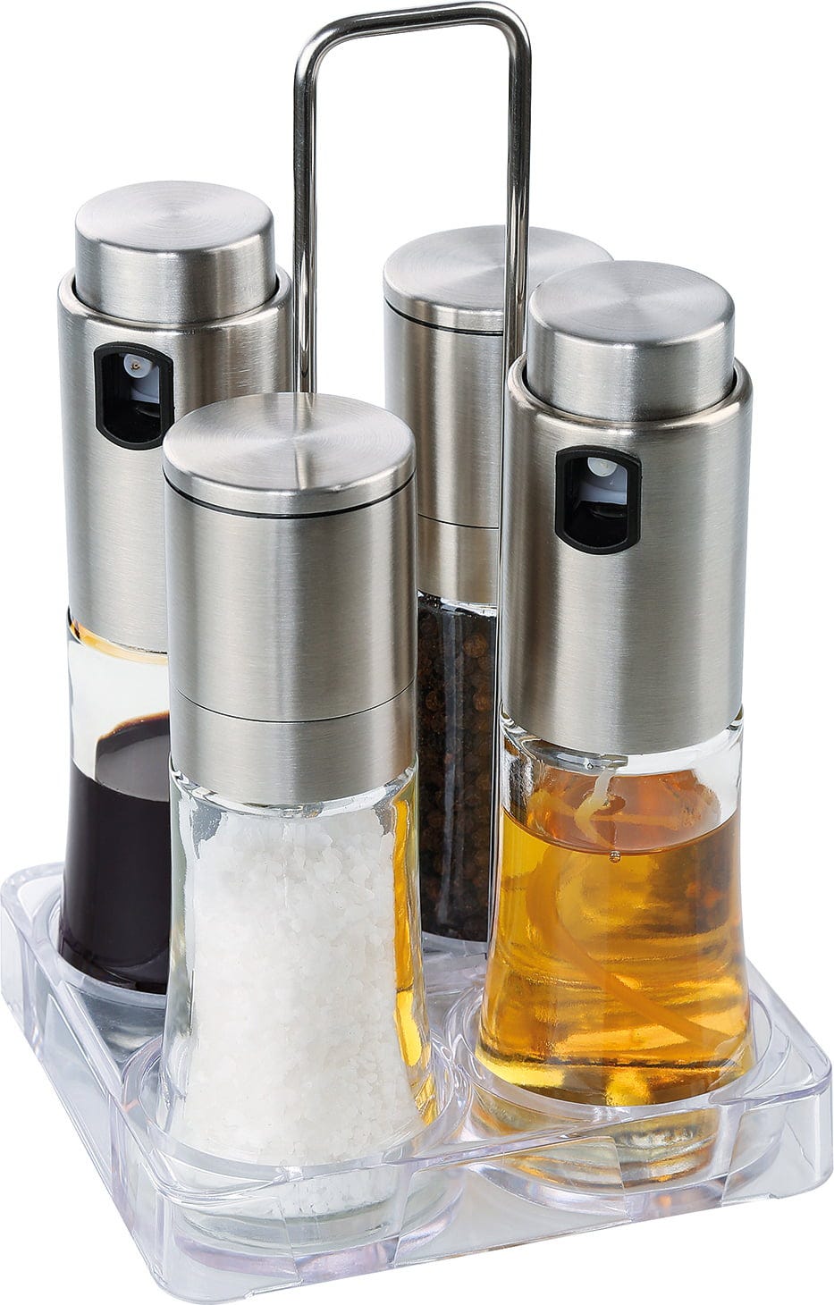 Le Quator BARI de cilio vous permet de présenter élégamment vinaigre, huile, sel et poivre directement sur la table. Les flacons en verre transparent révèlent les belles couleurs naturelles de l’huile d’olive dorée ou du balsamique foncé, et invitent à la personnalisation des plats. Les deux moulins sont équipés d’un mécanisme en céramique réglable en continu de qualité.