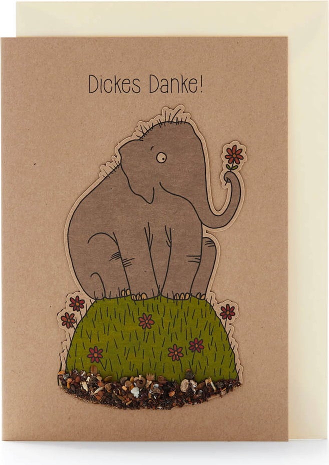 Vous ne savez pas comment remercier une personne qui vous est chère ? Alors cet adorable éléphant se charge de le faire pour vous ! Et il ne se contente pas de tenir une fleur dans sa trompe, il renferme également de nombreuses graines de fleurs, prêtes à être plantées dans la terre. En peu de temps, la personne à qui vous offrez la carte pourra admirer de jolies fleurs colorées !