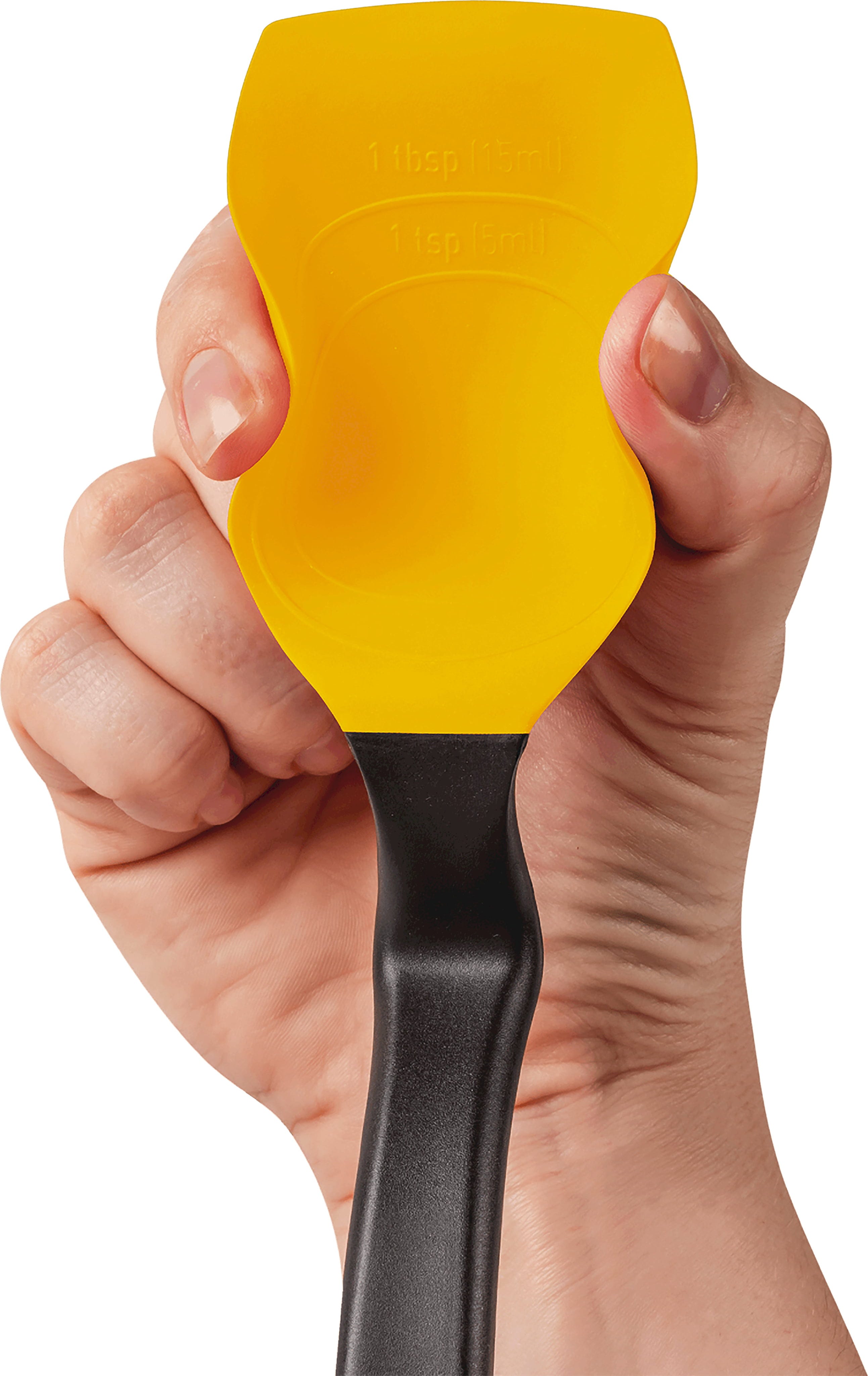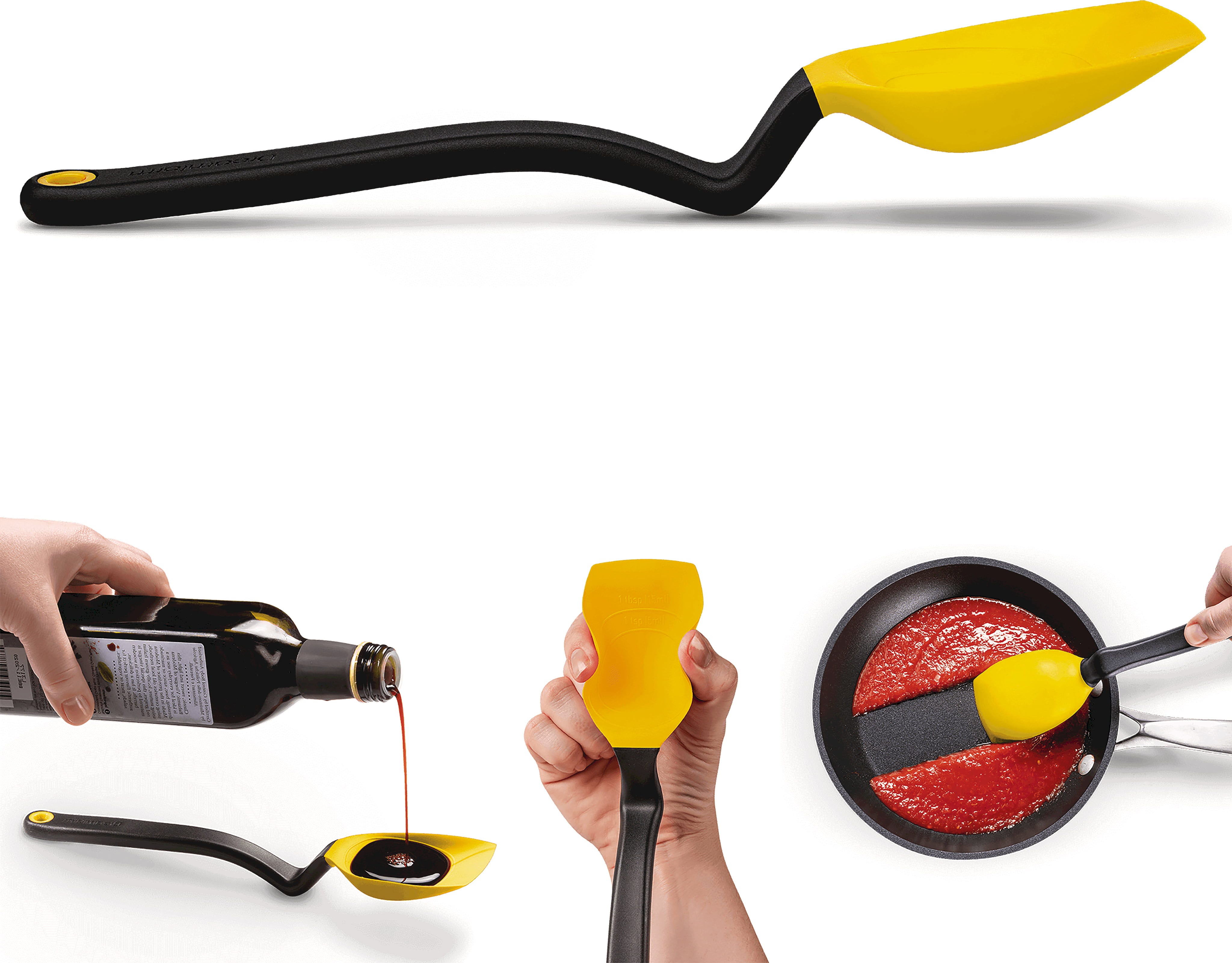 La courbure intégrée maintient la tête de la cuillère toujours surélevée du plan de travail, ce qui permet de la poser sans salir la surface. Elle peut également être accrochée directement au bord de la casserole. Les graduations intégrées permettent de mesurer précisément 15 ml (une cuillère à soupe), tandis que le Supoon résiste à la chaleur jusqu’à 260 °C.