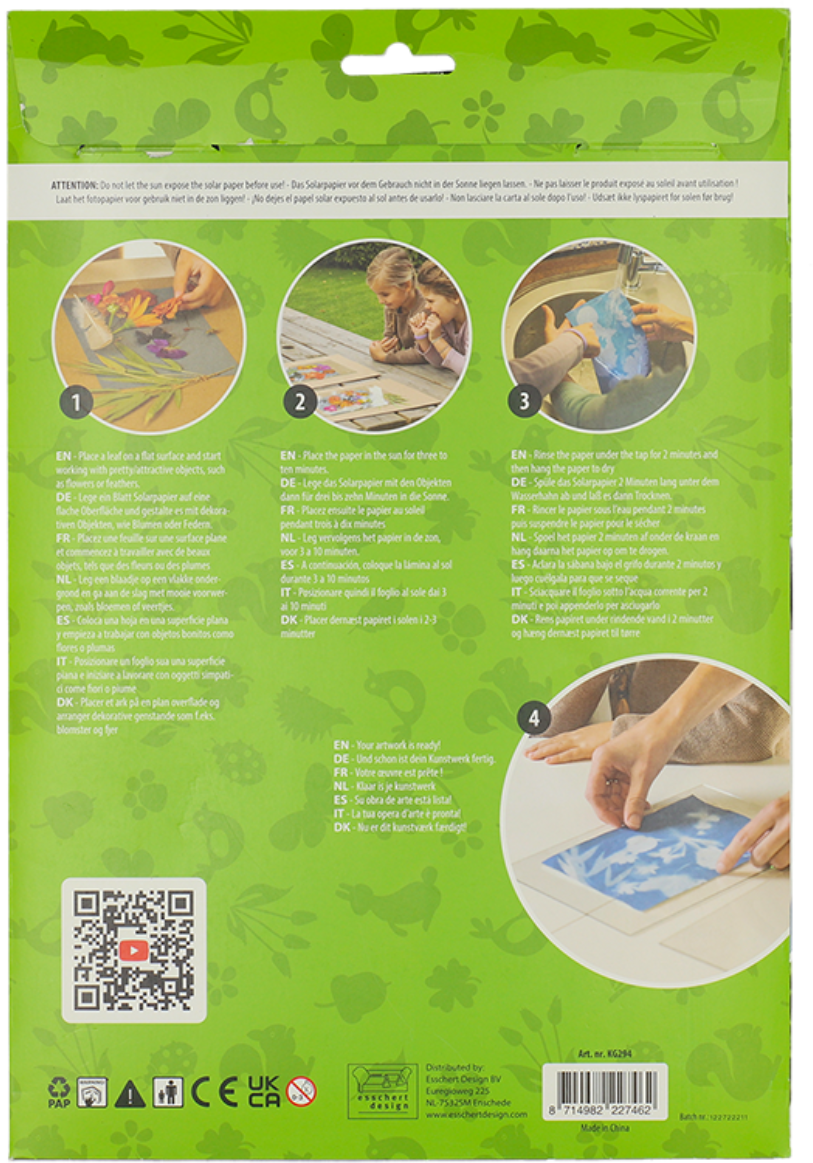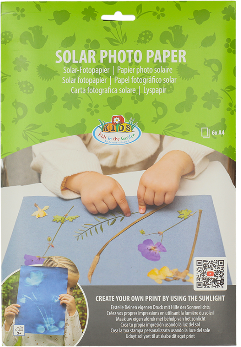 Avec ce papier solaire, créez des œuvres d'art très particulières,et ce uniquement grâce à la force du soleil ! Le papier réagit en effet aux rayons UV et donne ainsi naissance à de magnifiques motifs. Choisissez simplement quelque chose de beau comme des feuilles, des fleurs ou des plumes et posez-les sur le papier. Après une exposition d'environ 10 minutes au soleil, retirer les objets. Rincer ensuite le papier pendant 2 minutes sous l'eau courante afin de développer et de fixer le motif. Suspendez-le ensuite pour le faire sécher.