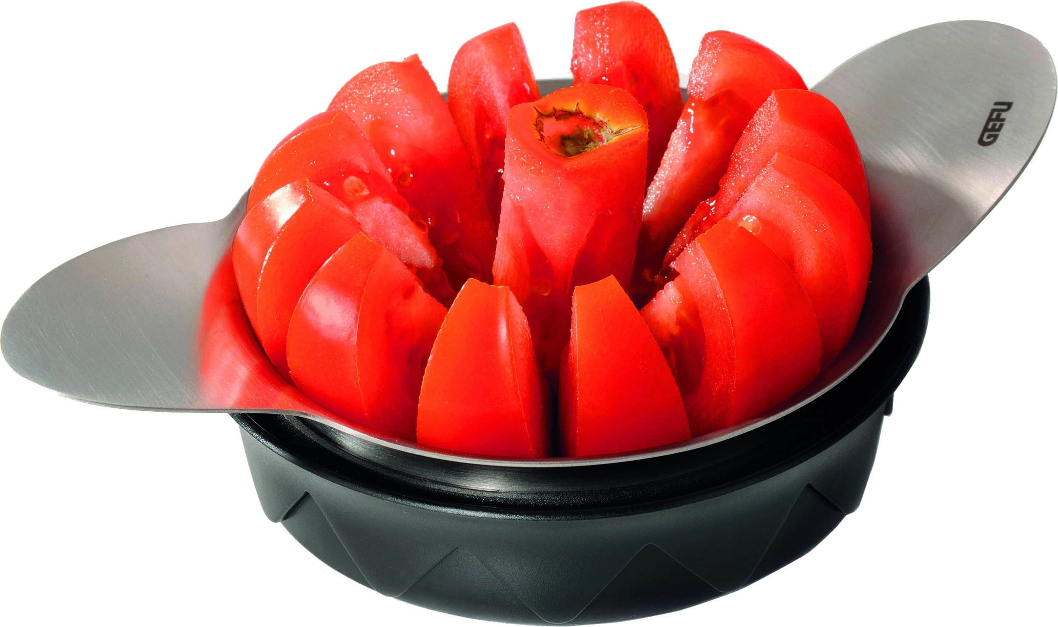 Le coupe-tomates et pommes de GEFU est l’allié idéal pour portionner fruits et légumes rapidement et de manière appétissante. En un seul geste, il permet d’obtenir douze morceaux parfaitement réguliers de tomates, pommes ou poires — et le plus pratique : le trognon ou le cœur est automatiquement retiré en même temps.