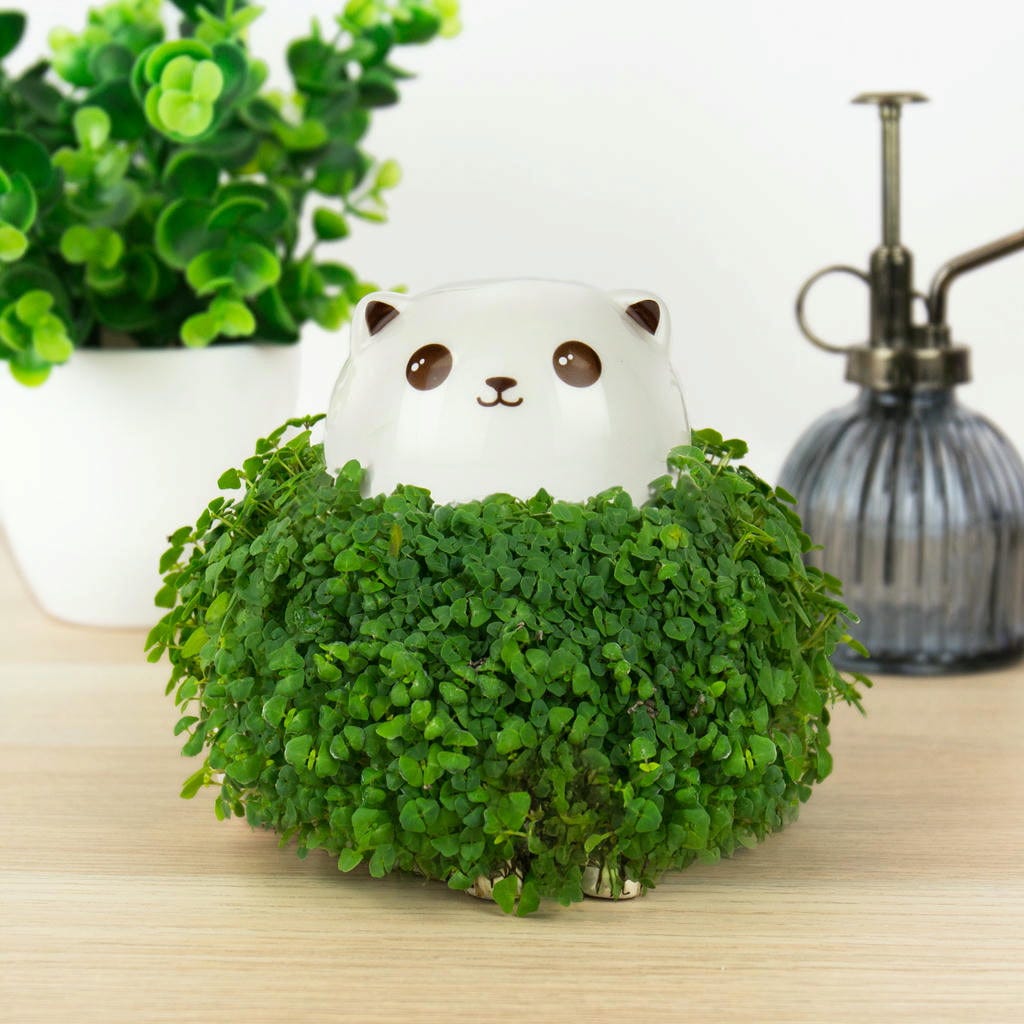 Ce charmant petit chat n’attend que d’être saupoudré avec les graines de chia incluses puis arrosé. Profitez de son pelage vert qui pousse progressivement.