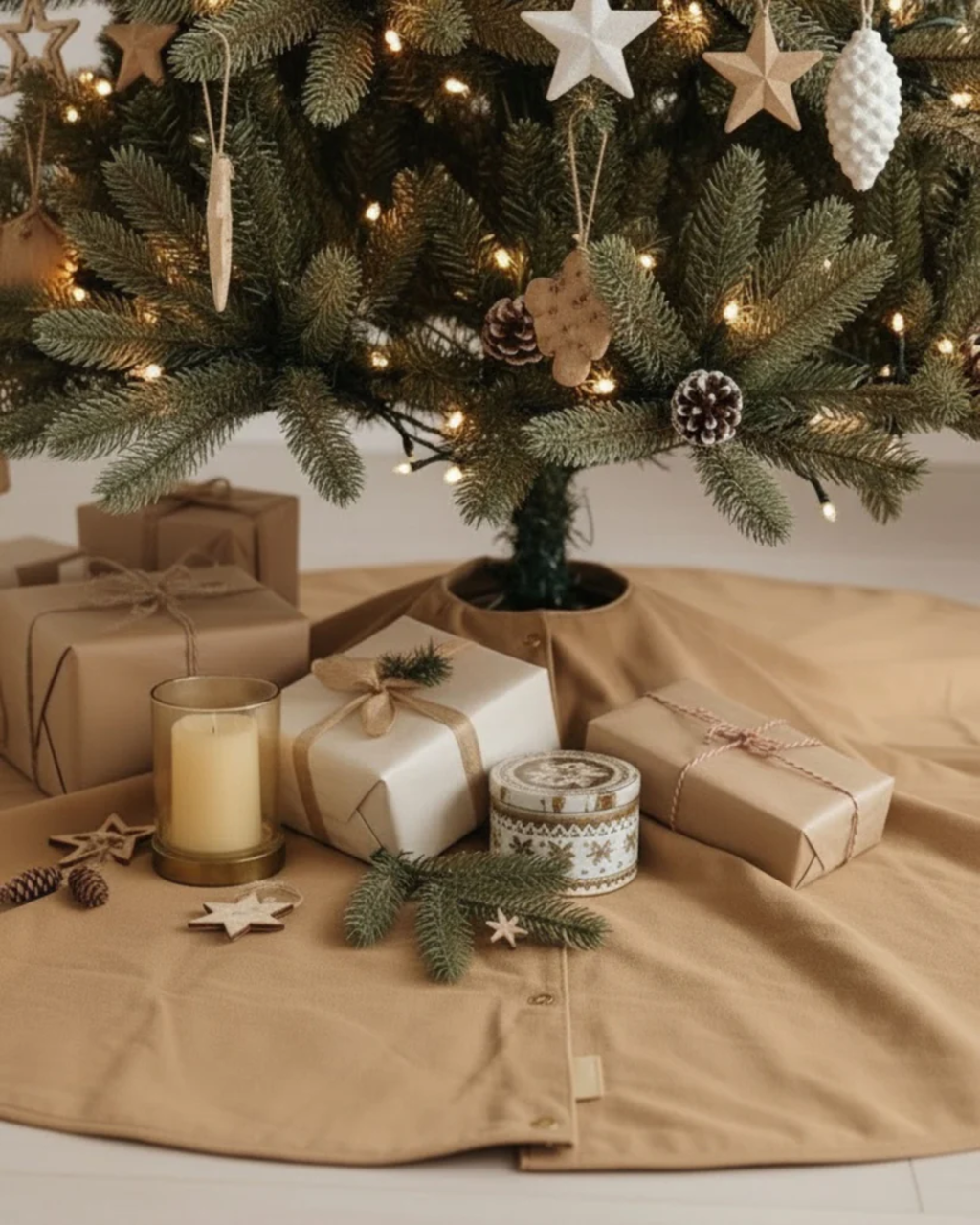 Cette jupe 2-en-1 de qualité supérieure apporte une touche finale élégante et harmonieuse à tout sapin de Noël. Le tissu en coton doux protège efficacement le sol contre les aiguilles et la résine, tout en créant une ambiance chaleureuse et festive. Grâce à son design réversible, elle permet de varier facilement le style : dans des tons beige-brun doux ou beige-sauge au choix.