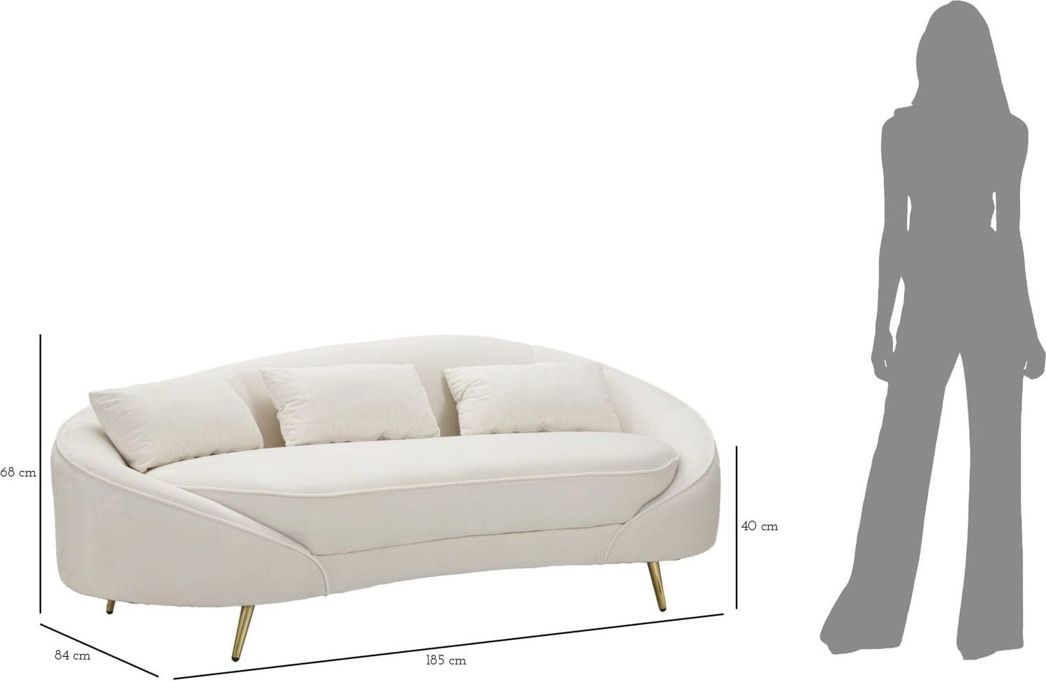 Le design contemporain est parfaitement complété par des pieds en métal doré minces et brillants, qui confèrent au canapé une touche de modernité et d'éclat. Trois coussins assortis sont inclus, complétant le confort d'assise élevé. Ce canapé est le complément idéal pour les intérieurs modernes et élégants qui privilégient le design, le confort et une atmosphère luxueuse.