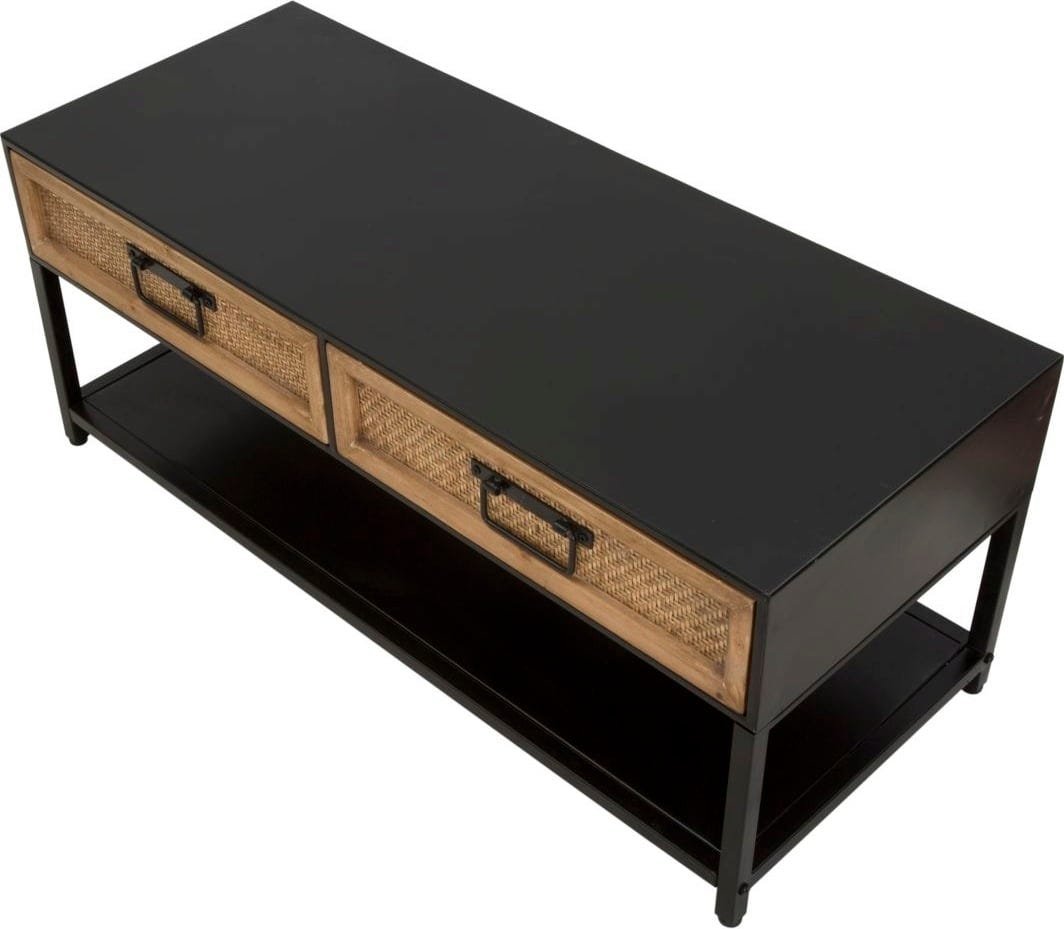 En contraste, les deux tiroirs en bois sont ornés d'une finition tressée en rotin sur leurs façades. Ce détail confère au meuble bas une texture chaleureuse et attrayante. Les tiroirs offrent un espace de rangement discret pour les accessoires et permettent de garder votre espace de divertissement organisé et élégant.