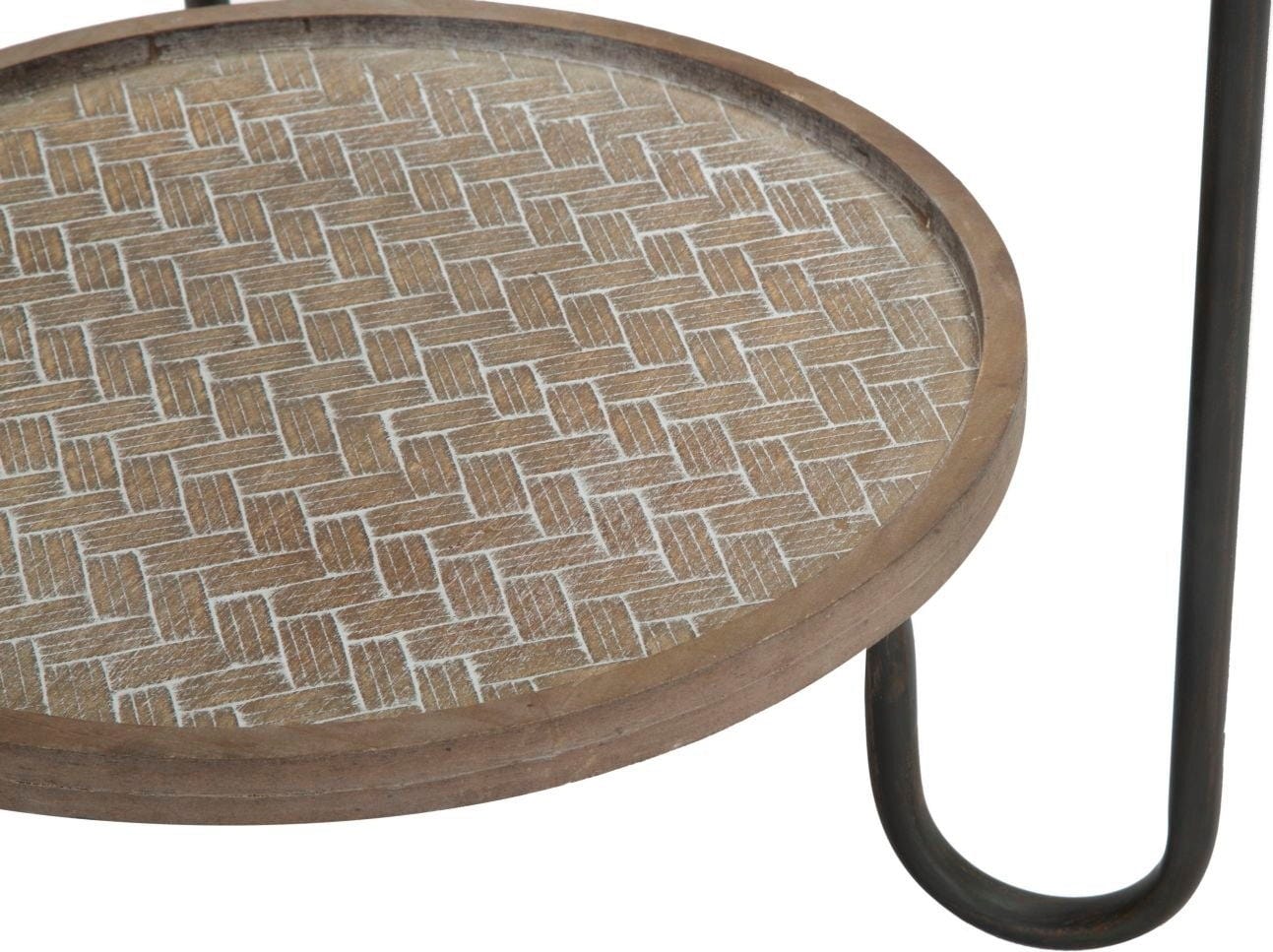 La table dispose de deux surfaces de rangement rondes : les plateaux sont en bois et présentent un aspect tressé moderne, qui apporte une touche chaleureuse et naturelle. Le niveau inférieur sert de rangement pratique pour les magazines ou les télécommandes.