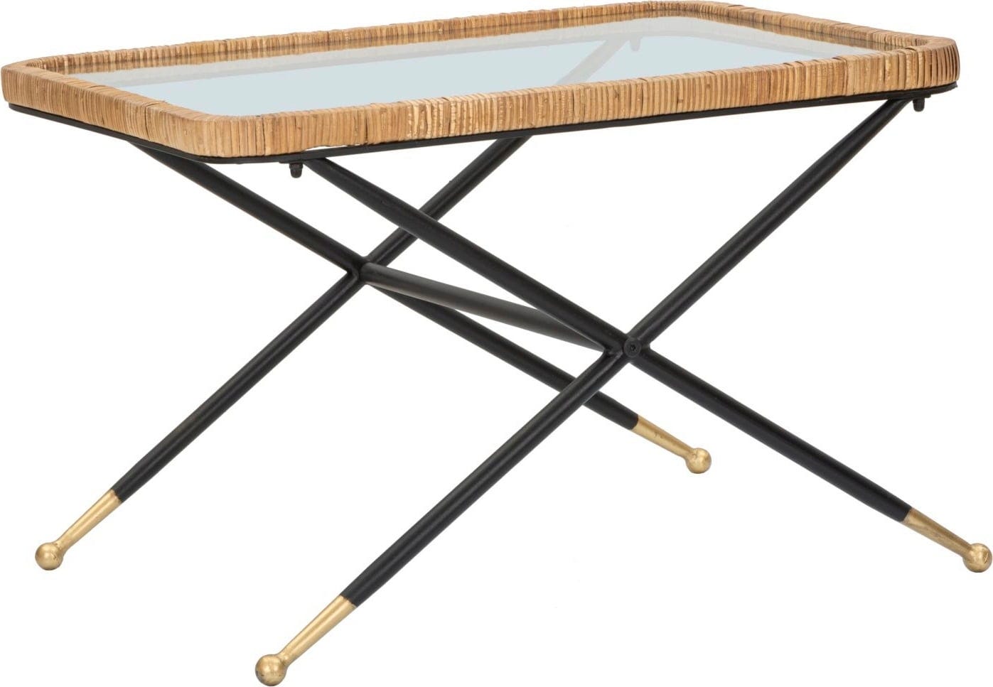 Offrez à votre salon une touche de design simple mais esthétique avec cette table basse rectangulaire ! Elle allie la transparence épurée d'un plateau en verre rectangulaire à la texture chaleureuse et naturelle d'un tressage en rotin qui encadre élégamment le plateau. La structure métallique noire robuste, avec ses pieds en forme de X, assure une grande stabilité et un contraste moderne.