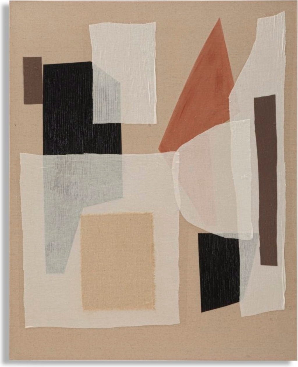 Le design associe des formes géométriques en noir, terracotta et différentes nuances de brun à de délicates applications textiles translucides. Ces voiles très fins se déposent comme un filtre sur les aplats colorés, et leurs superpositions créent de nouvelles nuances et des ombres subtiles. La rencontre entre graphisme net et textures douces confère à l’œuvre une esthétique à la fois calme et pleine de tension, idéale pour rehausser un espace avec style.